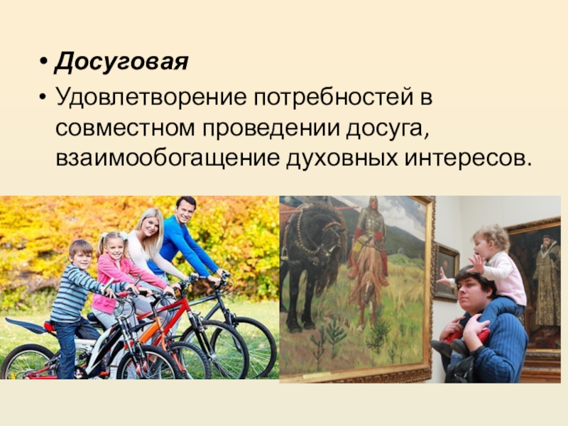 Удовлетворение потребностей в совместном проведении досуга, взаимообогащение духовных интересов.
