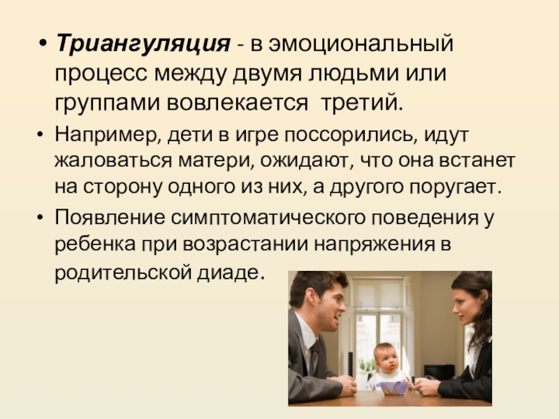 Слайд 27Триангуляция - в эмоциональный процесс между двумя людьми или группами