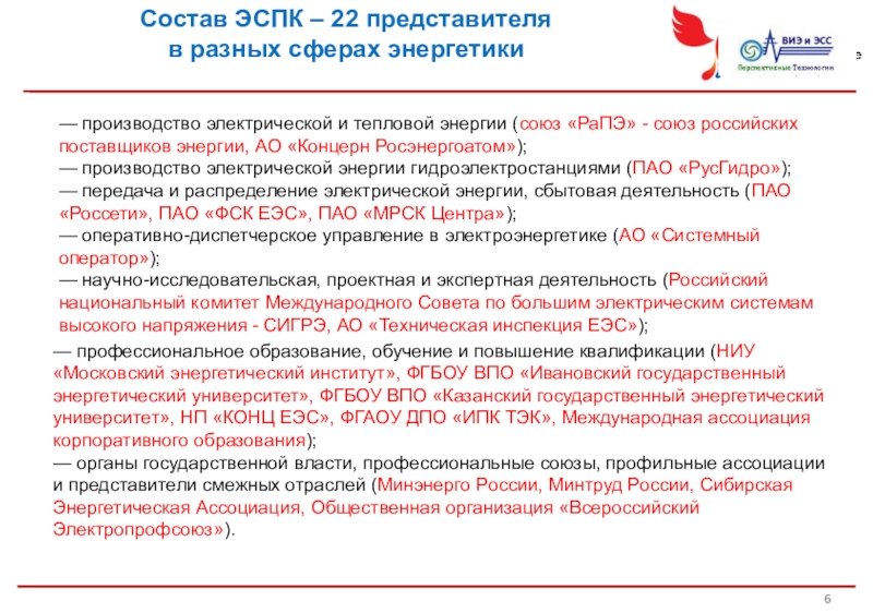— органы государственной власти, профессиональные союзы, профильные ассоциации и представители смежных отраслей (Минэнерго России, Минтруд России, Сибирская Энергетическая Ассоциация, Общественная организация «Всероссийский Электропрофсоюз»).