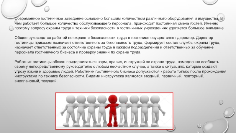 Работник гостиницы обязан придерживаться норм, правил, инструкций по охране труда, немедленно сообщать своему непосредственному руководителю о любом несчастном случае, а также о ситуациях, которые создают угрозу жизни и здоровью людей. Работники гостиничного бизнеса допускаются к работе только после прохождения инструктажа по технике безопасности. Видами инструктажа являются вводный, первичный, повторный, внеплановый, текущий.