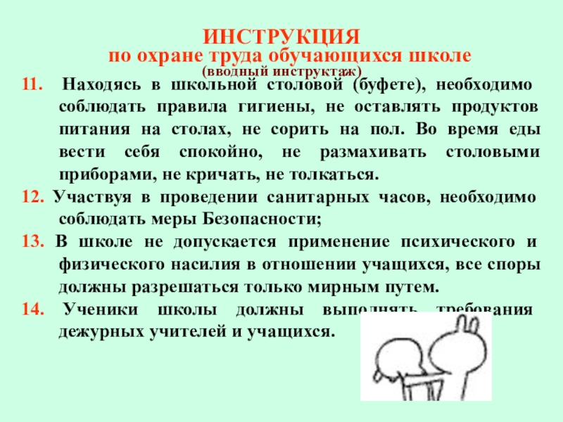 11. Находясь в школьной столовой (буфете), необходимо соблюдать правила гигиены, не оставлять продуктов питания на столах, не сорить на пол. Во время еды вести себя спокойно, не размахивать столовыми приборами, не кричать, не толкаться.