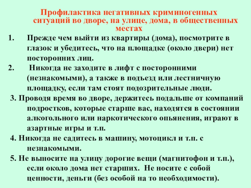 5. Не выносите на улицу дорогие вещи (магнитофон и т.п.), если около дома нет старших. Не носите с собой ценности, деньги (без особой на то необходимости).