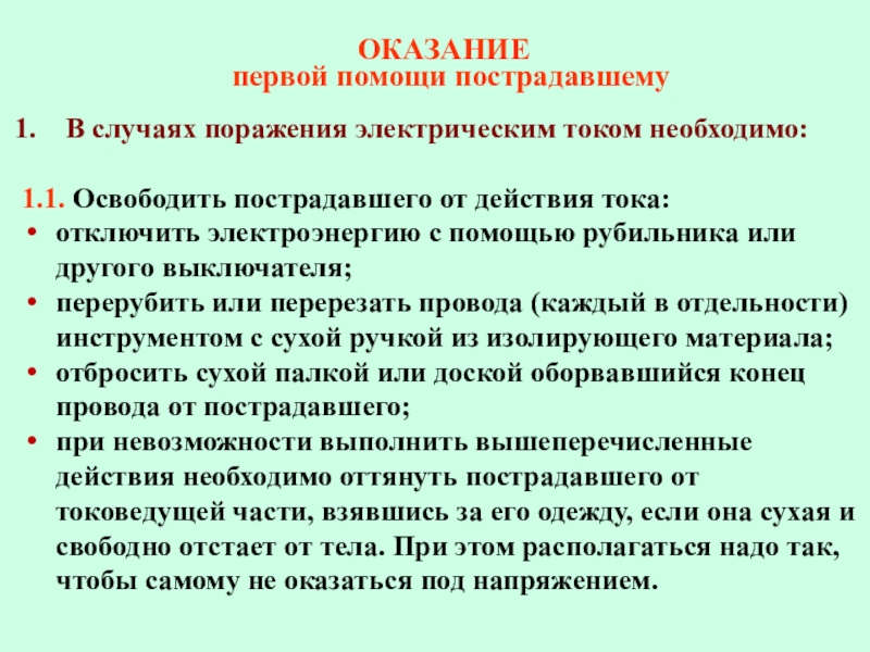 при невозможности выполнить вышеперечисленные действия необходимо оттянуть пострадавшего от токоведущей части, взявшись за его одежду, если она сухая и свободно отстает от тела. При этом располагаться надо так, чтобы самому не оказаться под напряжением.