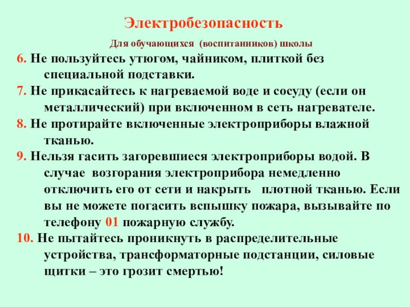 10. ЗАПРЕЩАЕТСЯ курить в помещениях школы, бросать зажженные спички в мусорные урны, засорять канализацию посторонними предметами, оставлять открытыми водопроводные краны.
