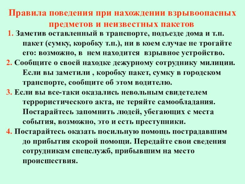 1. Заметив оставленный в транспорте, подъезде дома и т.п. пакет (сумку, коробку т.п.), ни в коем случае не трогайте его: возможно, в нем находится взрывное устройство.