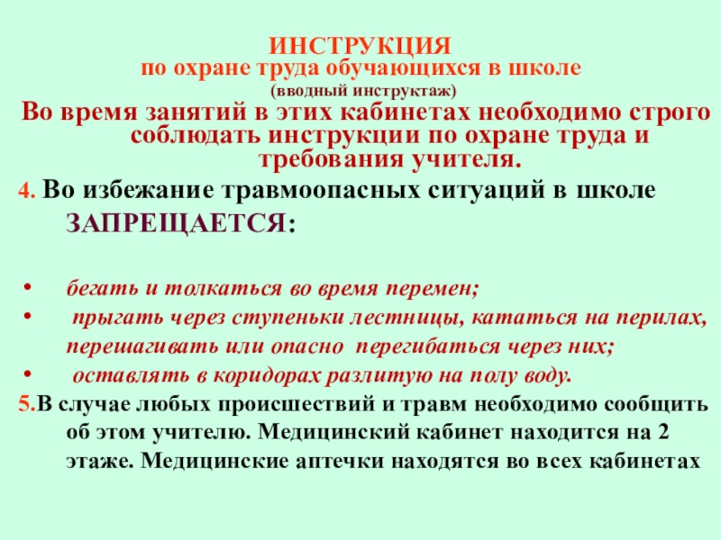 5.В случае любых происшествий и травм необходимо сообщить об этом учителю. Медицинский кабинет находится на 2 этаже. Медицинские аптечки находятся во всех кабинетах