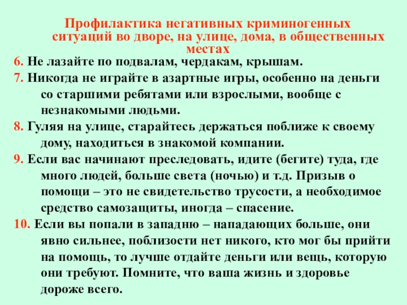 10. Если вы попали в западню – нападающих больше, они явно сильнее, поблизости нет никого, кто мог бы прийти на помощь, то лучше отдайте деньги или вещь, которую они требуют. Помните, что ваша жизнь и здоровье дороже всего.