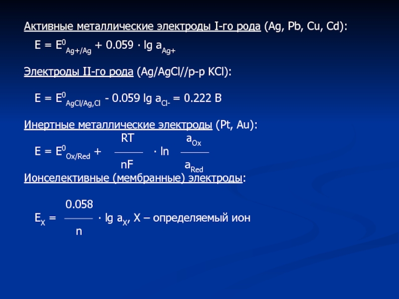 Слайд 5Активные металлические электроды I-го рода (Ag, Pb, Cu, Cd):