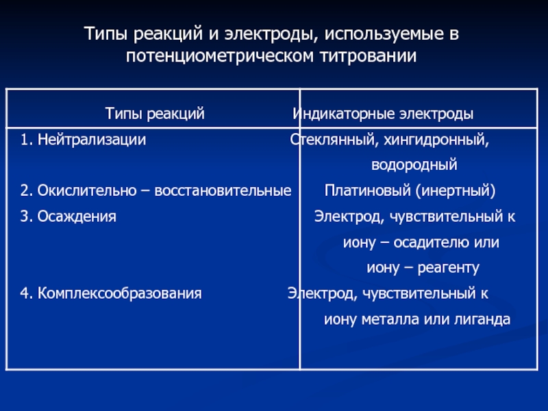 Слайд 20Типы реакций и электроды, используемые в потенциометрическом титровании