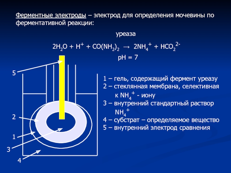 Слайд 12Ферментные электроды – электрод для определения мочевины по ферментативной реакции: