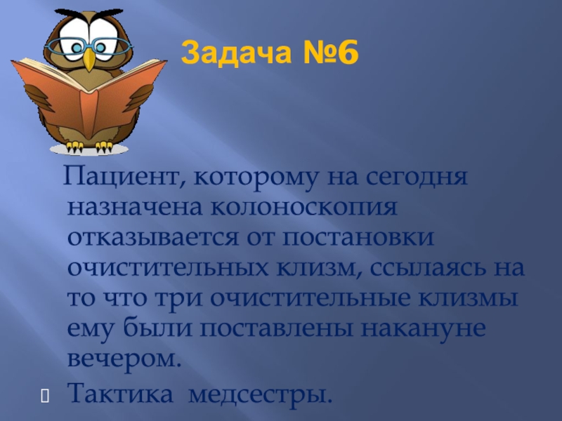 безшлаковую диету и поставить очистительные клизмы накануне и день исследования. Пациент отказывается, ссылаясь на то, что у него заболевание почек, а не кишечника.