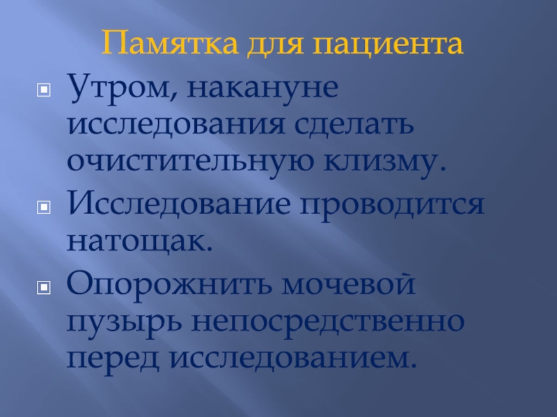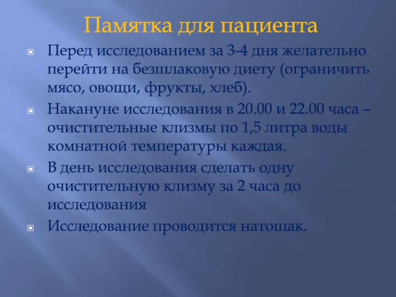 В день исследования сделать одну очистительную клизму за 2 часа до исследования