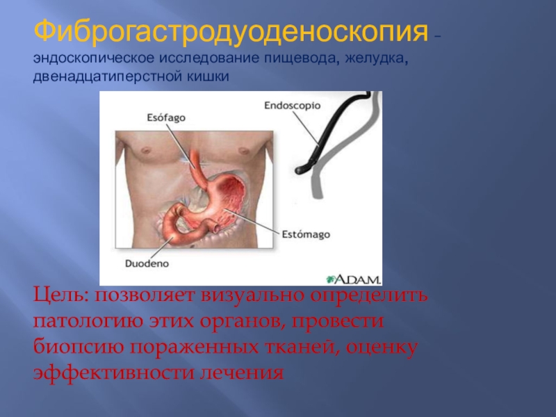 Слайд 5Фиброгастродуоденоскопия – эндоскопическое исследование пищевода, желудка, двенадцатиперстной кишки