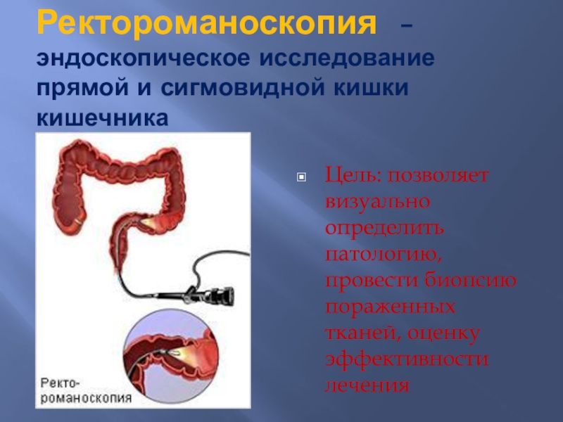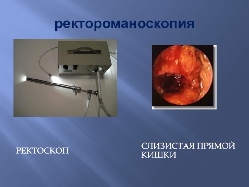Слайд 21Ректороманоскопия – эндоскопическое исследование прямой и сигмовидной кишки кишечника