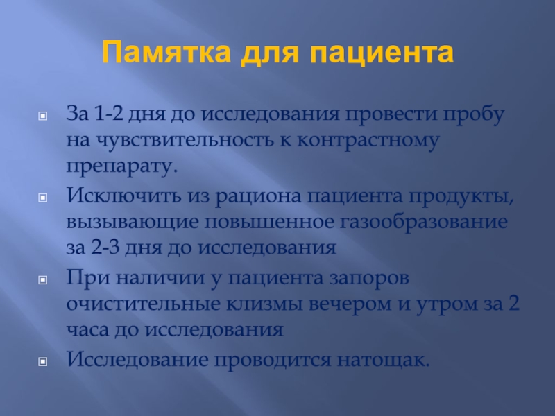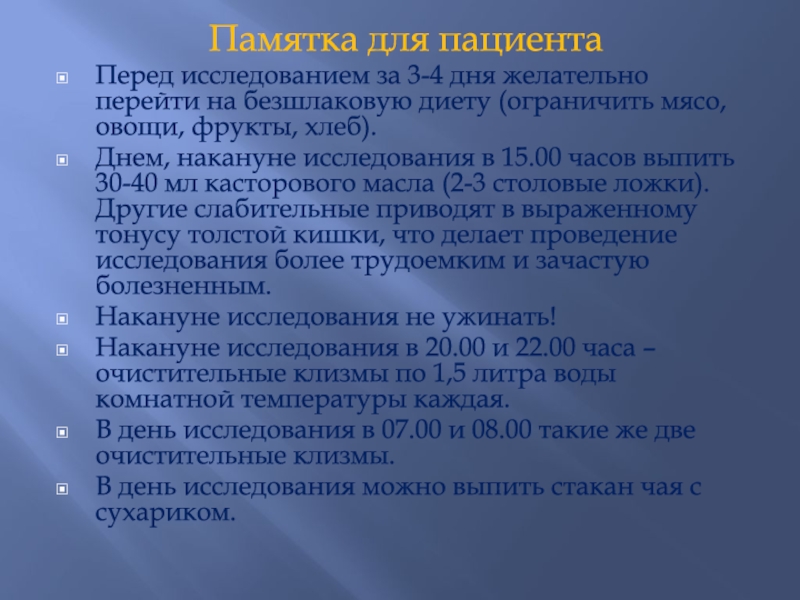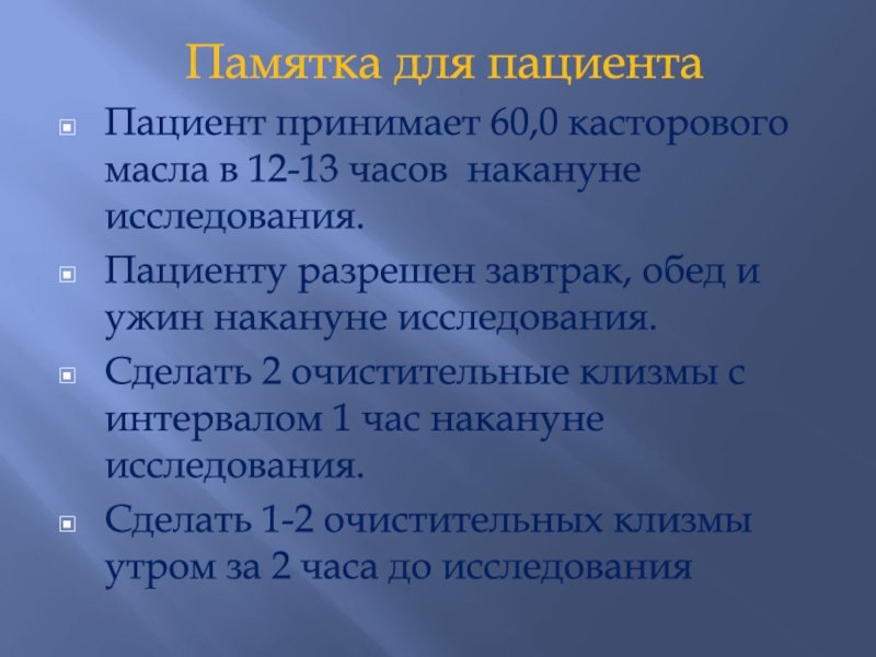 пациенту подготовку к исследованию, просит его накануне исследования принять касторовое