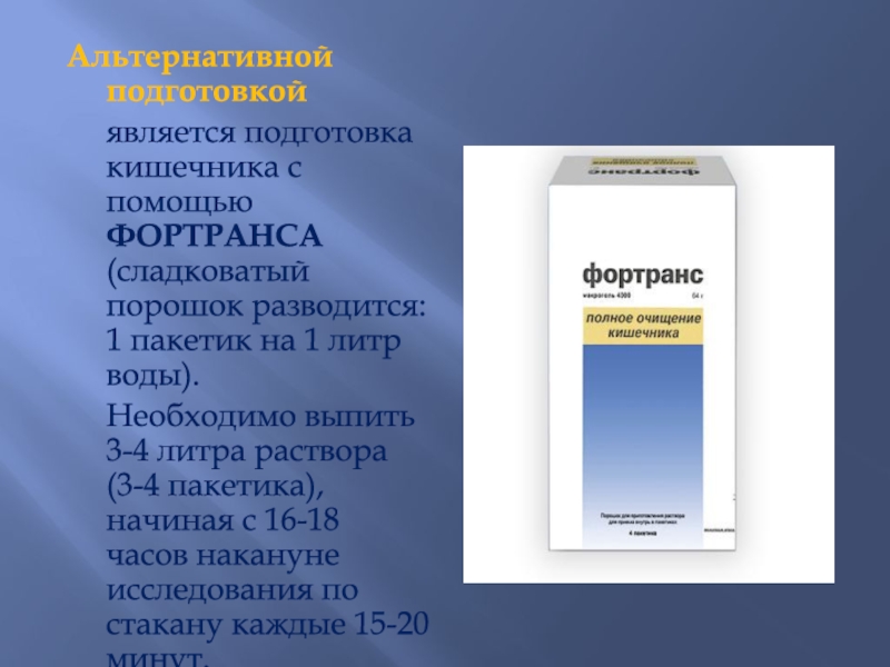 Необходимо выпить 3-4 литра раствора (3-4 пакетика), начиная с 16-18 часов накануне исследования по стакану каждые 15-20 минут.