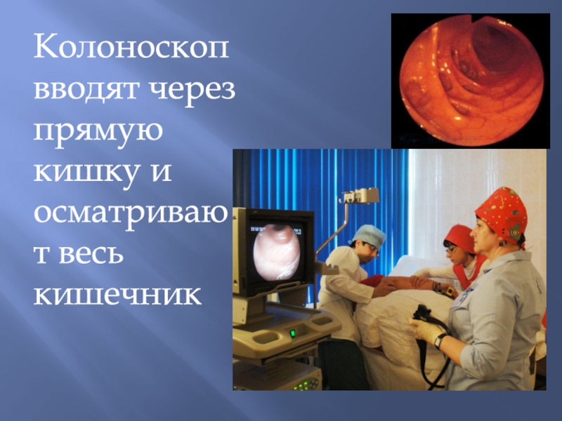 Слайд 14Колоноскоп вводят через прямую кишку и осматривают весь кишечник