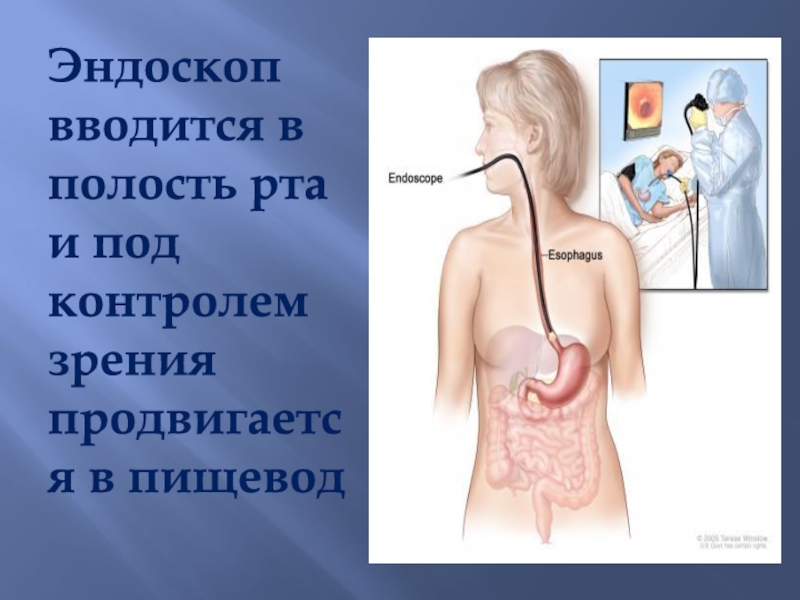 Слайд 6Эндоскоп вводится в полость рта и под контролем зрения продвигается