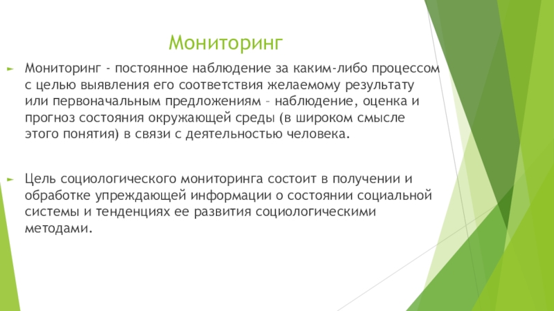 Цель социологического мониторинга состоит в получении и обработке упреждающей информации о состоянии социальной системы и тенденциях ее развития социологическими методами.
