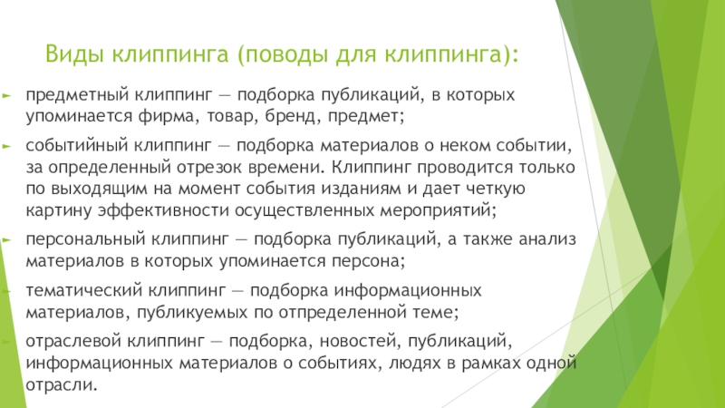 Слайд 25Виды клиппинга (поводы для клиппинга):