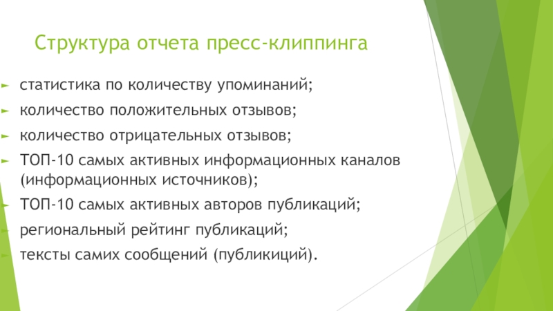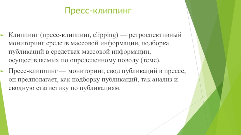 Пресс-клиппинг — мониторинг, свод публикаций в прессе, он предполагает, как подборку публикаций, так анализ и сводную статистику по публикациям.