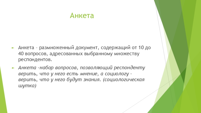 Анкета –набор вопросов, позволяющий респонденту верить, что