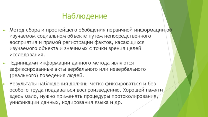 Результаты наблюдения должны четко фиксироваться и без особого труда поддаваться воспроизведению. Хорошей памяти здесь мало, нужно применять процедуры протоколирования, унификации данных, кодирования языка и др.