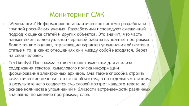 "Медиалогия" Информационно-аналитическая система разработана группой российских ученых. Разработчики исповедуют