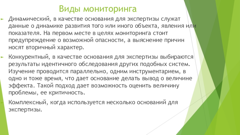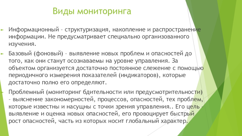 Проблемный (мониторинг бдительности или предусмотрительности) – выяснение закономерностей, процессов, опасностей, тех проблем, которые известны и насущны с точки зрения управления.. Его цель – выявление и оценка новых опасностей, его провоцирует быстрый рост опасностей, часть из которых носит глобальный характер.