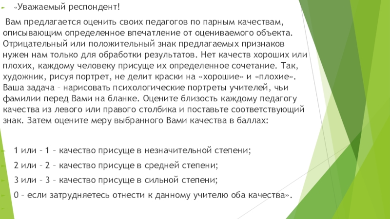 предлагаемых признаков нужен нам только для обработки результатов. Нет качеств хороших или плохих, каждому человеку присуще их определенное сочетание. Так, художник, рисуя портрет, не делит краски на «хорошие» и «плохие». Ваша задача – нарисовать психологические портреты учителей, чьи фамилии перед Вами на бланке. Оцените близость каждому педагогу качества из левого или правого столбика и поставьте соответствующий знак. Затем оцените меру выбранного Вами качества в баллах: