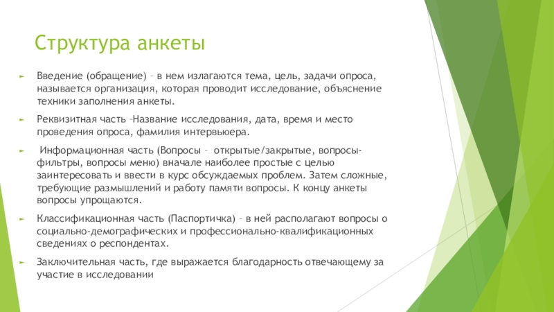 Информационная часть (Вопросы – открытые/закрытые, вопросы- фильтры, вопросы меню) вначале наиболее простые с целью заинтересовать и ввести в курс обсуждаемых проблем. Затем сложные, требующие размышлений и работу памяти вопросы. К концу анкеты вопросы упрощаются.