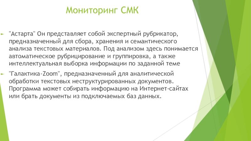 "Галактика-Zoom", предназначенный для аналитической обработки текстовых неструктурированных документов. Программа может собирать информацию на Интернет-сайтах или брать документы из подключаемых баз данных.