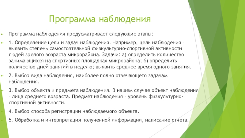 наблюдения. Например, цель наблюдения – выявить степень самостоятельной физкультурно-спортивной активности