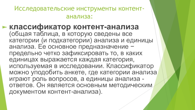 − предельно четко зафиксировать то, в каких единицах выражается каждая категория, используемая в исследовании. Классификатор можно уподобить анкете, где категории анализа играют роль вопросов, а единицы анализа - ответов. Он является основным методическим документом контент-анализа).