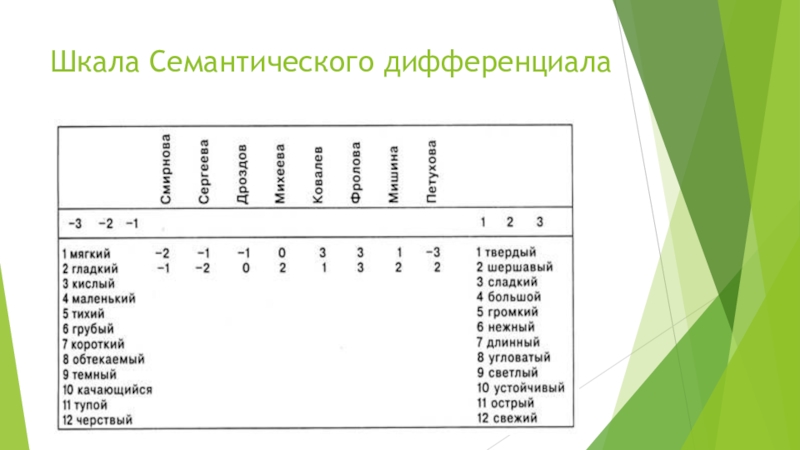 руководством Ч. Осгуда. Семантический дифференциал служит для качественного и количественного индексирования значений, смыслов с помощью двухполюсных шкал, задаваемых парами антонимичных прилагательных, между которыми расположены 7 градаций степени вхождения того или иного слова в данное качество.