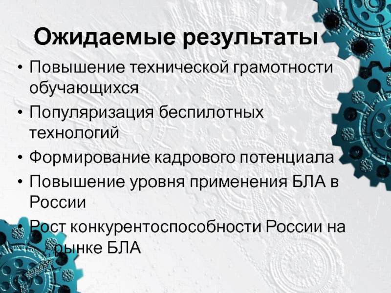Ожидаемые результаты Повышение технической грамотности обучающихся Популяризация беспилотных технологийФормирование кадрового потенциалаПовышение уровня применения БЛА в РоссииРост конкурентоспособности
