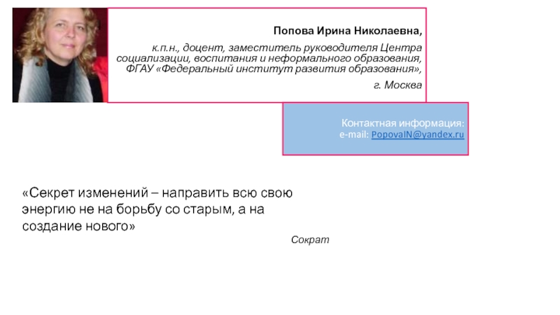 к.п.н., доцент, заместитель руководителя Центра социализации, воспитания и неформального образования