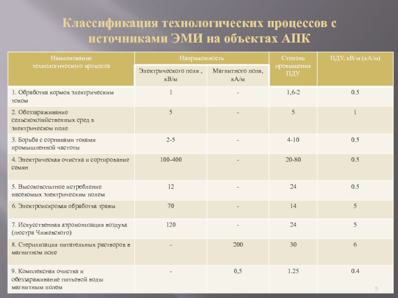 Слайд 5Классификация технологических процессов с источниками ЭМИ на объектах АПК