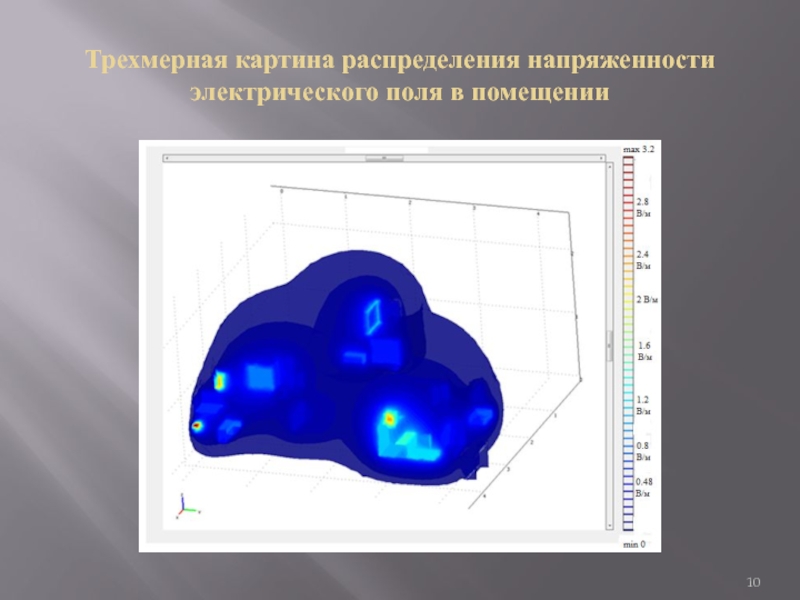 Слайд 10Трехмерная картина распределения напряженности электрического поля в помещении