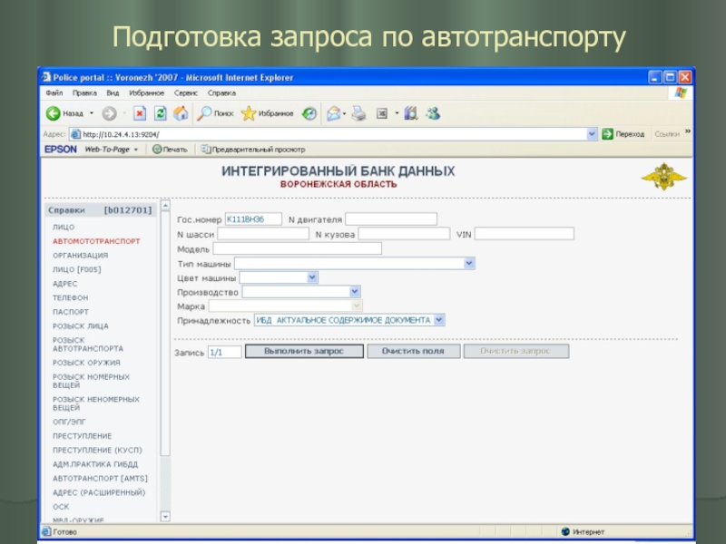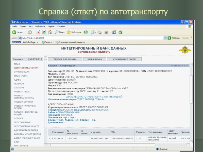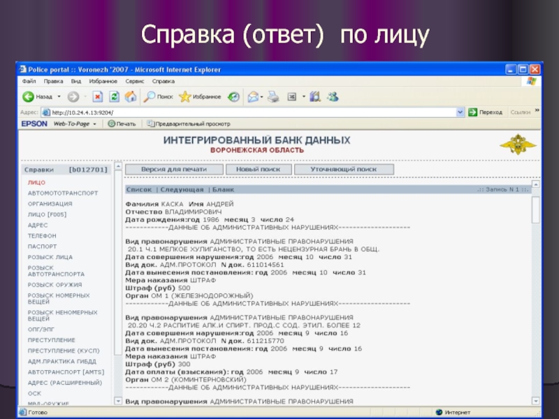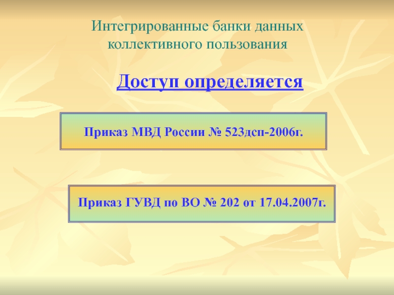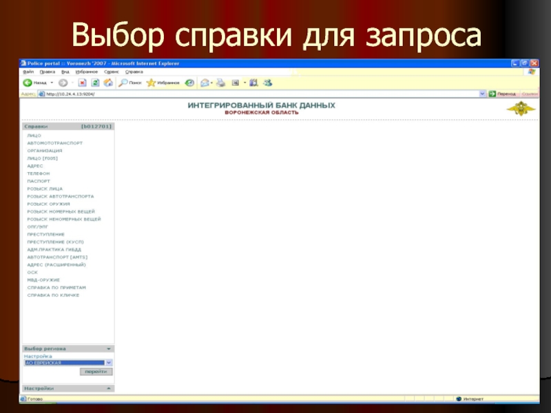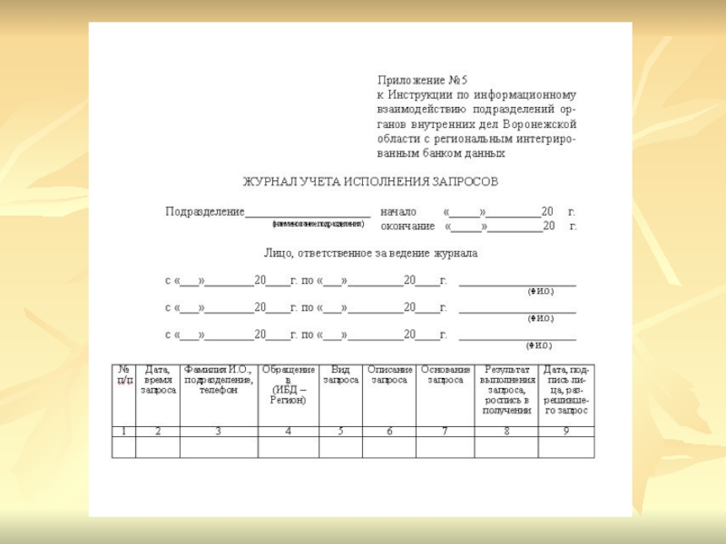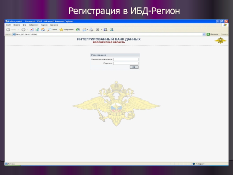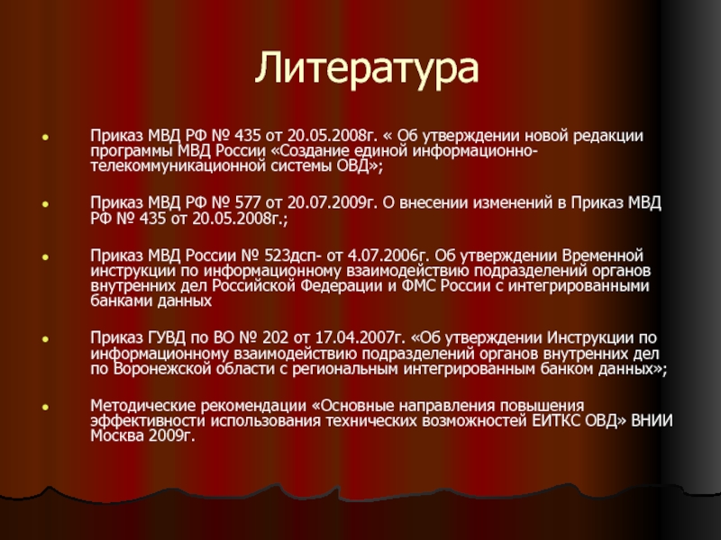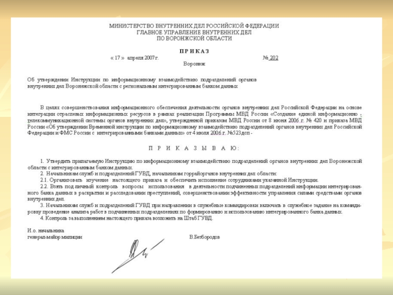 Приказ ГУВД по ВО № 202 от 17.04.2007г. «Об утверждении Инструкции по информационному взаимодействию подразделений органов внутренних дел по Воронежской области с региональным интегрированным банком данных»;