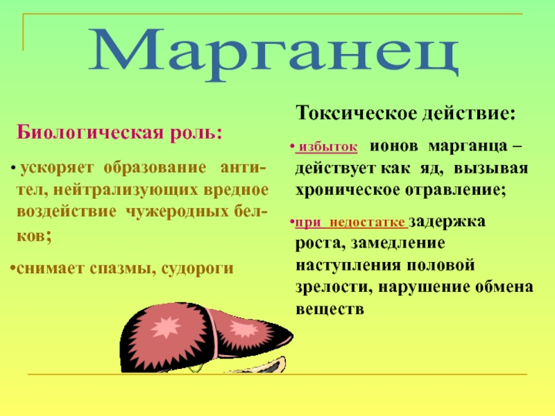 при избытке развивается за-болевание гемосидероз (на-копление железа в тканях и органах – печени, селезенки, костного мозга).