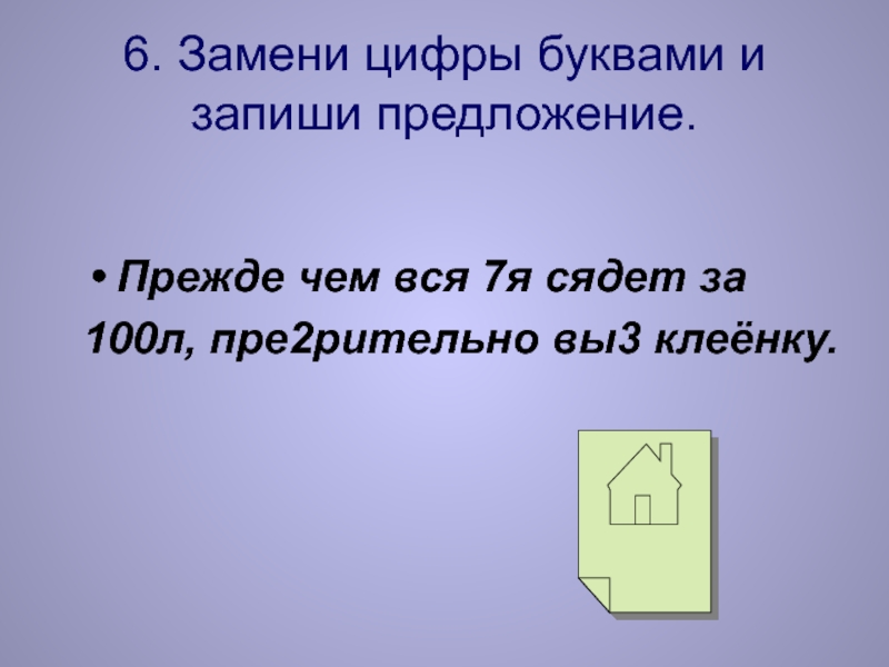 6. Замени цифры буквами и запиши предложение.Прежде чем вся 7я сядет за100л, пре2рительно вы3 клеёнку.