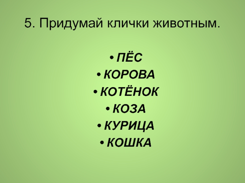 5. Придумай клички животным.ПЁСКОРОВАКОТЁНОККОЗАКУРИЦАКОШКА