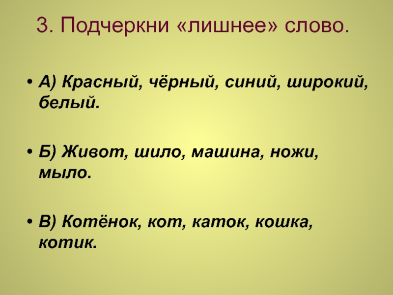 3. Подчеркни «лишнее» слово.А) Красный, чёрный, синий, широкий, белый.Б) Живот, шило, машина, ножи, мыло.В) Котёнок, кот, каток,
