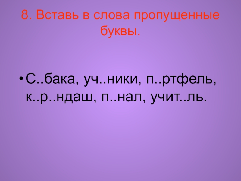 8. Вставь в слова пропущенные буквы.С..бака, уч..ники, п..ртфель, к..р..ндаш, п..нал, учит..ль.