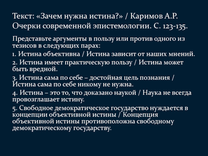 Текст: «Зачем нужна истина?» / Каримов А.Р. Очерки современной эпистемологии. С. 123-135.