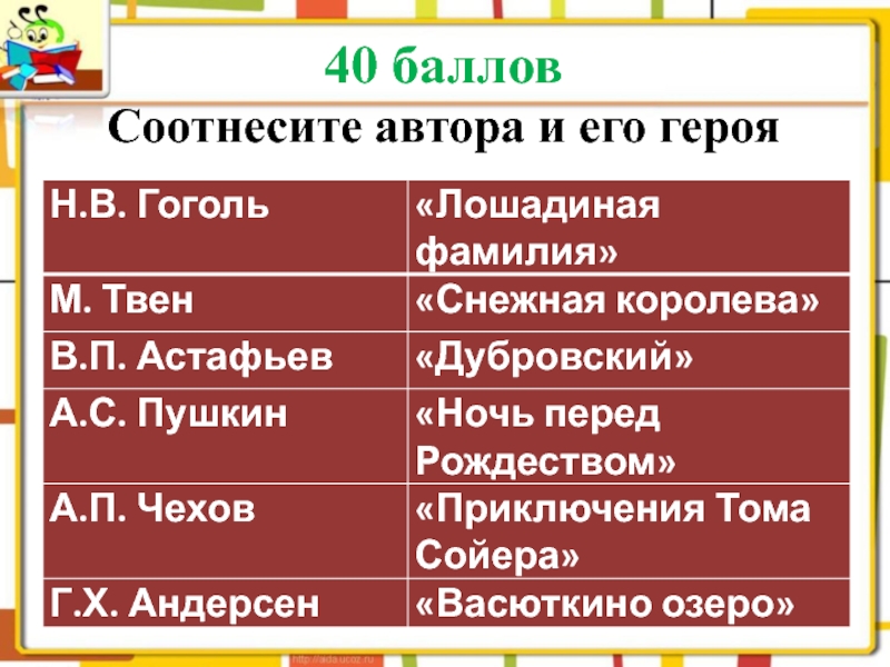 Слайд 4940 баллов Соотнесите автора и его героя