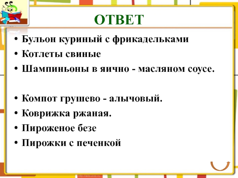 ОТВЕТБульон куриный с фрикаделькамиКотлеты свиныеШампиньоны в яично - масляном соусе.Компот грушево - алычовый.Коврижка ржаная.