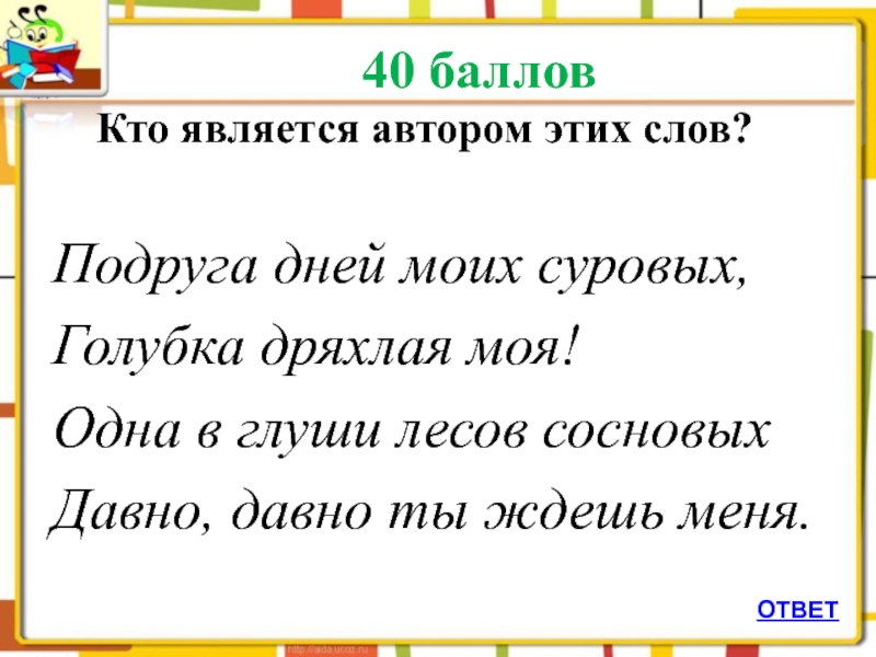 40 баллов	Кто является автором этих слов?Подруга дней моих суровых,Голубка дряхлая моя!Одна в глуши лесов сосновыхДавно, давно