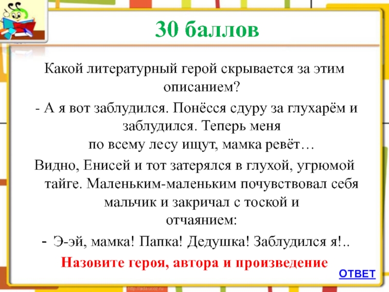 Назовите героя, автора и произведение